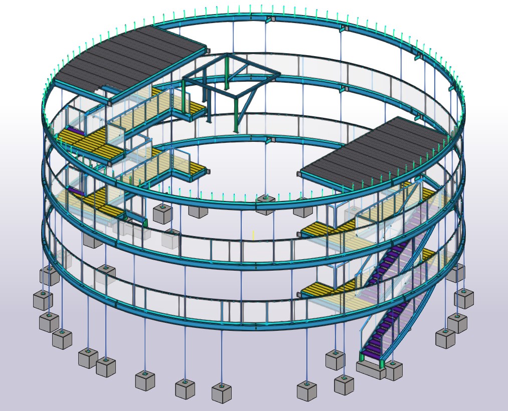 • The modeling of the curved stairs and handrail details (such as the wire net with eye bolts) was fully prepared in 3D, including clash detection.