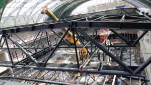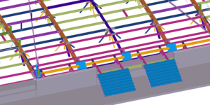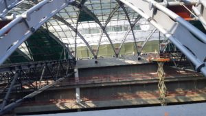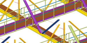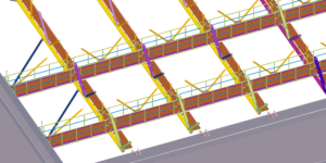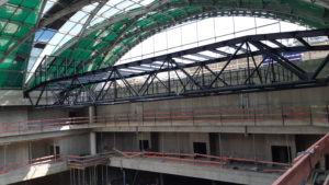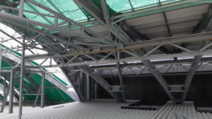 – Další skupinou lávek jsou 500mm široké lávky z podlah.roštů vedené podél dol.pasů vazníků z jedné strany. Tyto lávky nebudou mít zábradlí a budou vybaveny lankem vedeným podél vazníků a sloužícím jako jistící systém. Po těchto lávkách se bude pohybovat obsluha vybavená OOPP.