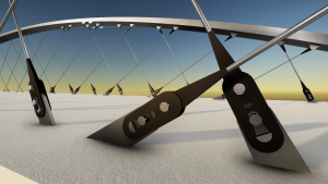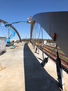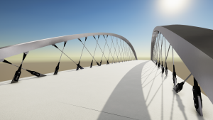 The steel arch is designed with variable cross-section. At the top, the cross-section of the arch has a width of 1360 mm and a height of 300 mm, at the foot of the arch, has the width of 1000 mm and a height of 600 mm. Due to that the side walls of the arch are formed by a wrapped surface. The arch is connected to the bridge deck by the foot segment which follows the arch and by four plates running into the bridge deck. The foot segment follows the layout curvature of the bridge deck. Due to that the concreted plates are spatially rotated relative to the arch.