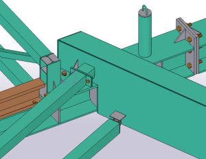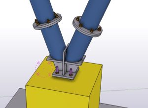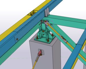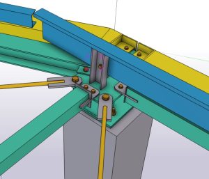 Główną konstrukcję zadaszenia nad wejściem zaprojektowano jako belki stalowe wykonane z kształtowników szerokostopowych walcowanych typu HEA opartych na stalowych słupach o profilu rury okrągłej połączonych przegubowo ze stopami fundamentowymi. Na głównych belkach typu HEA zaprojektowano stalowe kratownice zadaszenia. Pomiędzy kratownicami przewidziano dodatkowe elementy umożliwiające montaż obudowy konstrukcji zadaszenia.
