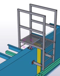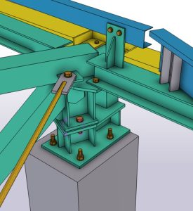 The main structure of the canopy over the entrance is designed as steel beams made of HEA-type wide-alloy rolled sections supported on steel columns of circular tube profile articulated with foundation feet. Steel canopy trusses were designed on the main HEA beams. Additional elements are provided between the trusses to allow the roof structure cladding to be installed.