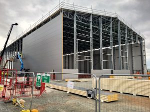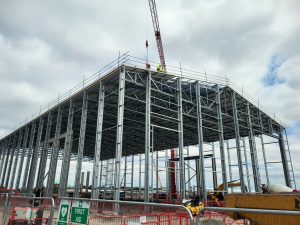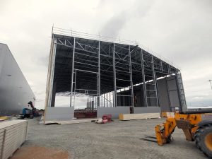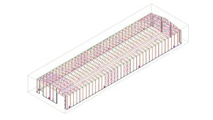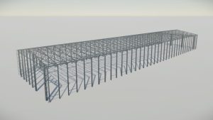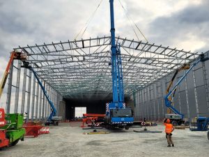 Het gebouw is opgetrokken uit gegalvaniseerd, koudgevormd staal, de kern van Frisomat’s unieke bouwsysteem. Ondanks de meer dan 4.000 individuele profielen blijft de constructie eenvoudig te monteren. Het frame bestaat uit vakwerkliggers en de kolommen zijn opgebouwd uit dubbel uitgevoerde Sigma450-profielen. Voor de dak- en wandbekleding is gekozen voor sandwichpanelen van een externe leverancier. Opvallend zijn ook de vier megadeuren van 9,75 bij 9,75 meter, waarvoor HEA300-profielen gecombineerd werden met ons eigen koudgevormd staal.