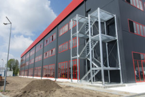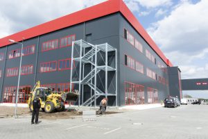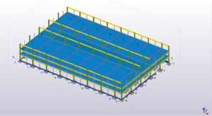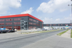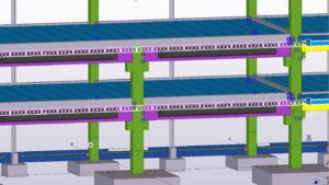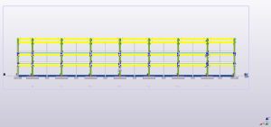 The building is a three-story building, based on a grid with a 12x12m spacing, no basement. Shaped on a rectangular plan with axial dimensions 59.16×89,16m. The supporting structure is made of reinforced concrete prefabricated elements (columns, beams) stiffened with concrete slabs. Roof in a steel structure (outside the scope of our project). Wall cladding with sandwich panel with mineral wool filling. Dilatation of the building was designed in axis 5. The dilatation is realized by means of sliding pads.
