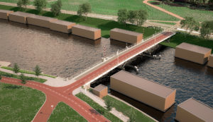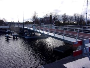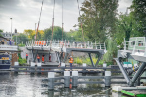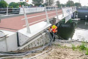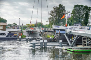 The minimalist design of the bridge is based on the view over the canal and this provides an elegant and slender appearance. It seems as if the bridge is floating over the water. The technical facilities such as barriers, lighting and cameras are integrated in the design. The cylinders and the counterweight are located under the bridge deck, so that the slenderness of the bridge is retained.