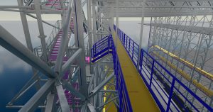 On levels +13.48 and +19.08 additional working platforms based on horizontal wall wind braces. Platforms necessary for proper communication, enabling the construction of a floating unit. Entrance to platforms via internal staircases located in the corners of the hall. In the southern part, in the immediate vicinity of the crane, an additional working platform as communication with the crane bridge and as an access element for its direct maintenance. On the roof, it is planned to make a large working platform in terms of area, connected directly to the roof structure. The number of support points of the working platform on the roof should be strictly limited in order to reduce places where vertical supporting elements penetrate the roof covering, which in places of penetrations requires significant work in order to shape an appropriate seal of the penetrations. A greater number of roof penetrations significantly increases the risk of the sheathing leaking and the occurrence of a defect that may affect the use of the building.