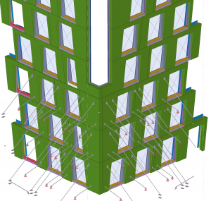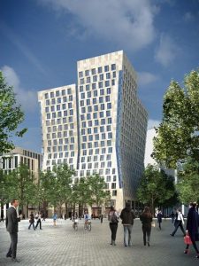 Except for his prominent location, Hourglass has other special features: except for the in situ stability cores nothing is straight in the Hourglass design. From the third floor the facades are built from prefab panels, developed by Byldis Prefab and Byldis Facades. The principle of M-shaped panels is used from the bottom to the top of the building, but every prefab panel that is used, is different. For example because of embeds, thickness or plate division. Besides all this, the finishing of the panels is absolutely luxurious. The whole exterior of the building is made of Turkish limestone. Marble stone which is assembled in the prefab factory in Tilburg, just like the aluminium frames and glazing. The fact that we execute the biggest part of the marble stone elevation in prefab sandwich panels is revolutionary. The panels will be assembled on site with two tower cranes. All this is only possible because of the good cooperation between Hurks bouw, Byldis prefab and Byldis Facades.