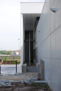 The building itself is a concrete structure with wooden beams which span 39.4 meters. Aside it, there is a structure completely in prefabricated concrete with slabs on different levels to hide the terrace and technical platform. There is an overhanging roof all around the building and at the entrance an architectural canopy reaches all the way to the basement. The steel structure of the canopy was detailed by Staalbouw Verelst in TEKLA.
