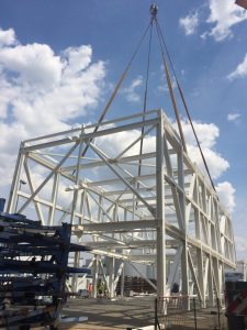 Longest field was lifted in three phases. The first was raised by the outer parts, which were mounted on the RC construction. Then the center field was inserted between the two fields.