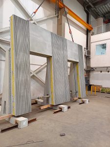 Panel production was carried out horizontally on tilting casting beds. Transportation was carried out using low-loader pallet transporters (Flatliners). The outer shell was reinforced using welded mesh, while the load-bearing core was detailed with preassembled column and beam type reinforcement cages. The individual layers of the panel are connected using stainless steel connector plates, torsion tubes, and U-shaped bars. The wall-to-slab connections are designed using zipper rebar connectors. Vertical connections between stacked panels are achieved with rebar couplers, while horizontal joints between adjacent panels are made using custom in-situ reinforcement, completed with concrete pour.