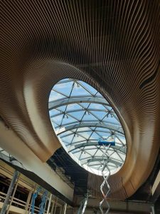 The largest shopping centre in the Netherlands, the Mall of the Netherlands, has been built in Leidschendam. One of the eye cathcers of the shopping centre is the central hall. Over the central hall an oval shaped glass canopy has been placed, called the Dome. Vic Obdam Staal was commissioned by Ballast Nedam to fully design and assemble the Dome. What makes this dome unique is that it is placed on hinged pendants and each part is turned at an angle to the adjoining parts.