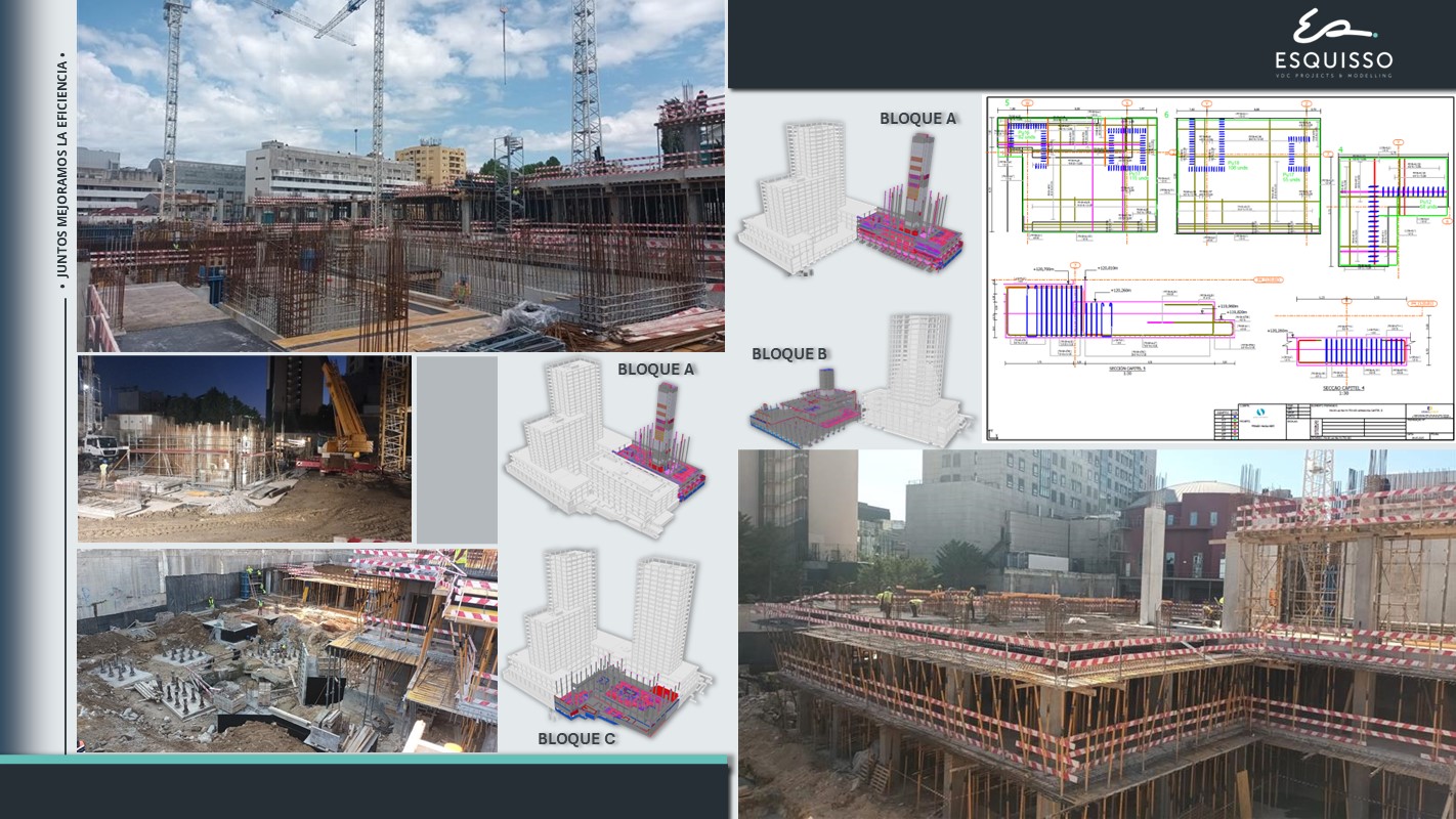 El edificio, de 26 plantas y dos sótanos, se divide en tres bloques estructurales que responden a criterios de diseño y ejecución altamente exigentes. Gracias a la integración avanzada entre Tekla Structures, Rhino y Grasshopper, el equipo de Esquisso desarrolló una aplicación personalizada para el modelado automatizado del refuerzo, lo que permitió optimizar procesos, reducir errores y aumentar la eficiencia del flujo de trabajo.
