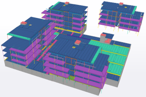 Hagejordet – a residential estate located in Norway in Lillehammer (Søre Ål district). The project consists of a complex of 4 buildings and an underground parking hall located under three of them. The building was designed using prefabricated technology. The load-bearing structure of the garage consists of reinforced concrete exterior walls, DLB reinforced concrete columns and beams, and HSQ steel beams. The load-bearing structure of the 4- and 5-story buildings consists of a core of reinforced concrete precast walls and columns and steel beams on the facades. The floors are designed with hollow core slabs. The buildings also have precast reinforced concrete balconies supported on a steel substructure.
