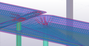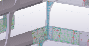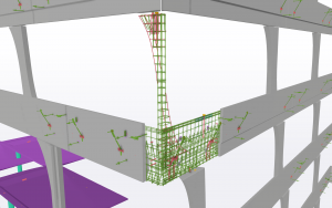 Ook de gevelelementen zijn in vorm, wapening, maltechniek, productie, transport en montage bijzonder. Voor de complexe vormen zijn in Tekla de gekromde verticale onderdelen overgenomen vanuit het Architectenmodel en aan de merken toegevoegd. Vanuit deze betonvorm is verder gewerkt aan het verankeringssysteem, maltechniek en de wapening. De verankeringen zijn berekend door de leverancier en zodoende door ons in Tekla uitgewerkt. Deze informatie is in IFC uitgewisseld met de opdrachtgever voor afstemming aan de hoofddraagconstructrie.