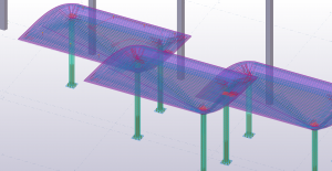 The facade elements are also special in terms of shape, reinforcement, moulding, production, transport and assembly. For the complex shapes in Tekla, the curved vertical parts have been taken from the Architects model and added to the cast units. From this concrete form, further work was done on the anchoring system, moulds and the reinforcement. The anchors to the supporting structure were calculated by the supplier and then elaborated by us in Tekla. This information was exchanged in IFC with the client for coordination to the main building structure.