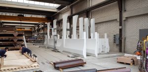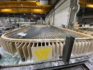 De fabricage van het wapeningsnet is voor een dergelijke vorm als het luifelelement een hele uitdaging. Voor het vervaardigen van het wapeningsnet is een contramal gebruikt. Daarbij is constant het 3D model geraadpleegd om de gecodeerde wapening in de vooraf bepaalde werkvolgorde in elkaar te fabriceren. Nadat het wapeningsnet en de andere voorzieningen in de mal zijn gelegd, wordt het beton gestort. Na 16 uur drogen wordt het element eruit getild en gestald op de werkplaats. Deze elementen worden vervolgens vervoerd naar de bouwplaats en daar op zijn plek gezet!