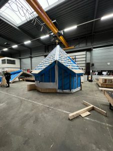 The second difficulty is producing the roof structure. To have the least amount of elements we design a roof structure with rafter and strut connecting with floor, which also turn a 45degree around the corner. Its a concept of multiple pizza slices connecting with eachother. With the help of Tekla Structures and Timber components we developed one corner of the roof, marked it, and simply copied & rotate/mirror from zero point to create the roof of the first tower.