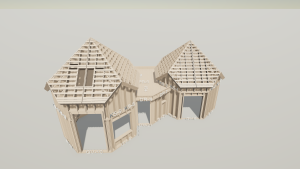 Het tweede moeilijkheid is het produceren van het dakconstructie. Voor het min mogelijke aantal elementen zijn wij een dak element gaan ontwerpen waarbij het kap aansluit met de vloer met hulp van een kreupele stijl. Waarbij de kreupele stijl ook nog eens 45graden de hoek om gaat. Onder het noemen van het maken van pizza puntjes. Met hulp van Tekla Structures en Timber componenten hebben wij één hoekje van de kap uitgewerkt, hier een merk van gemaakt en éénvoudige kopiëren&draaien/spiegelen vanaf een nul punt om zo het dak van één torentjes te tekenen.