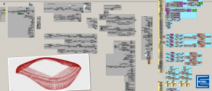 A volumene és bonyolultsága miatt már a feladat legelején nyilvánvaló volt, hogy a geometriát csak parametrikus megközelítéssel tudjuk kezelni. Jelen projekt során a parametrikus modell építéséhez a Rhinoceros CAD programot, és a hozzá tartozó Grasshopper grafikus programozó felületet használtuk. A parametrikus modellből közvetlenül generáltuk a Tekla Structures modellünket, amit aztán a projekt előrehaladtával tovább részleteztünk.