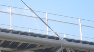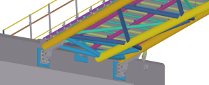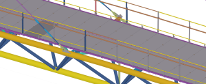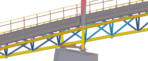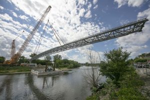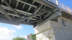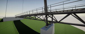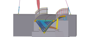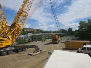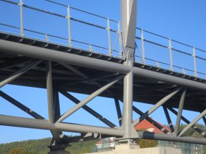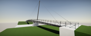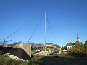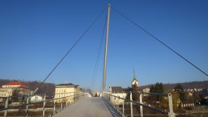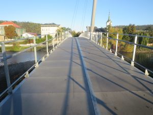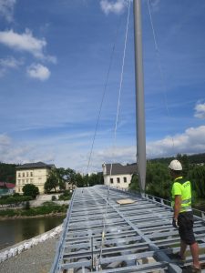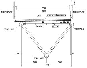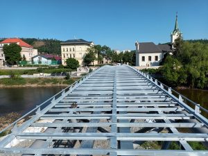 The new 110 m long footbridge over the Berounka River is suspended on a single-truss asymmetrical pylon, which is hinged directly on the upper flange of the truss structure. The original solution was created on the basis of the wishes of the architect Pleskot, who was also the author of the architectural and urban design of the original concrete footbridge, which the new footbridge replaced.