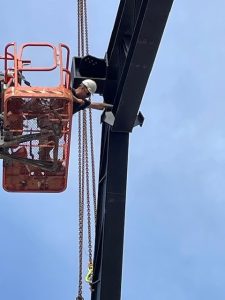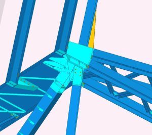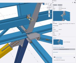 Om deze complexiteit te beheersen, werd gebruik gemaakt van geavanceerde 3D-modellering in Tekla Structures, gekoppeld aan het Trimble-platform. Dit liet toe om tijdens overlegmomenten de verbindingen visueel toe te lichten, taken te structureren via ToDo’s en opmerkingen van onder meer de stabiliteitsingenieur direct te verwerken. Het 3D-model van de staalstructuur werd bovendien volledig geïntegreerd in het globale BIM-model, wat toeliet om potentiële conflicten met andere bouwdelen tijdig op te sporen en te vermijden. Gezien de technische complexiteit en de hoge kwaliteitsvereisten werden in de werkplaats 3D-scans uitgevoerd van kritieke knooppunten. Deze werden nadien ingelezen als puntenwolken in het Tekla-model, zodat de correcte positionering van platen en verbindingen kon worden gecontroleerd vóór montage op de werf.
