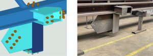 To manage this complexity, advanced 3D modeling in Tekla Structures was used, linked to the Trimble platform. This allowed for visual explanations of the connections during meetings, structuring tasks via ToDos, and directly incorporating comments from, among others, the structural engineer. The 3D model of the steel structure was fully integrated into the overall BIM model, enabling timely detection and avoidance of potential conflicts with other building components. Given the technical complexity and high-quality requirements, 3D scans of critical nodes were conducted in the workshop. These were subsequently imported as point clouds into the Tekla model, allowing for verification of the correct positioning of plates and connections before on-site assembly.