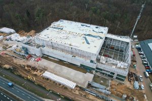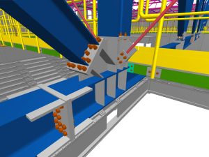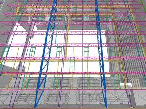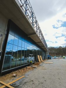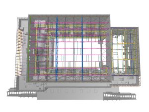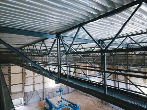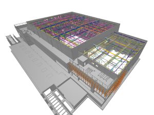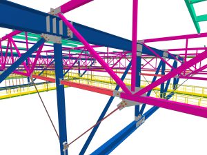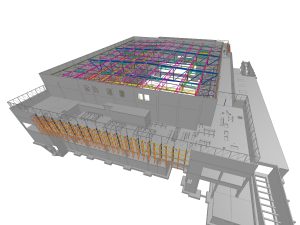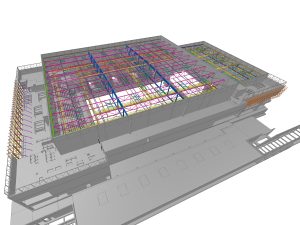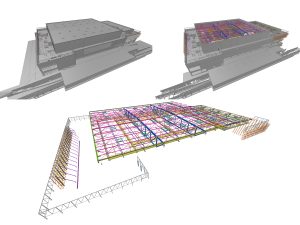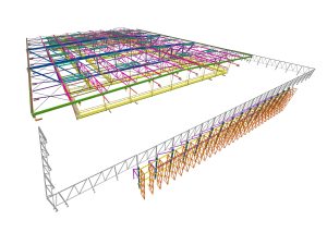 Due to the large spans of the structure, the roof covering was designed on purlins and lattice girders. Welded steel trusses made of HEA, HEB profiles and rectangular pipes. Due to the large spans, the girders and purlins have assembly joints where the shipping elements are connected with bolts. At the level of the upper and lower chords, braces have been designed that will transfer horizontal forces from the wind and stabilize the structure during assembly. Lattice purlins are based on girders, steel beams embedded in reinforced concrete walls, and on steel edge beams based on columns.