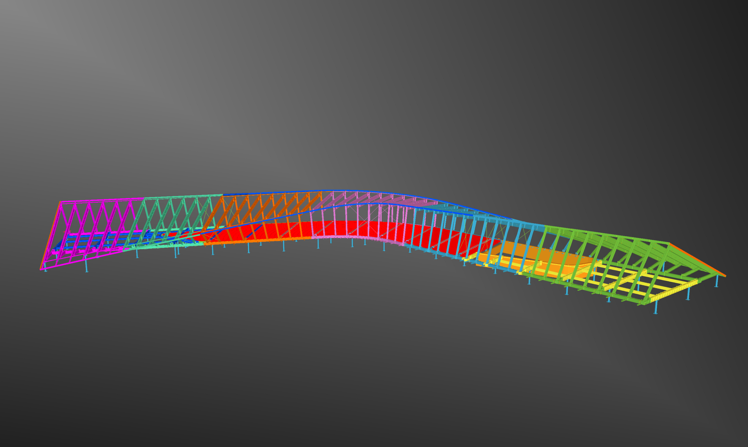 The building is located on the west coast of Greenland (250km north from the Arctic Circle). Its shape corresponds with the amazing landscape of glaciers. The load-bearing system is formed by steel frames, which shape changes continuously from triangular to rectangle, to finally reach triangular shape again. Modelling of an object waving in various surfaces was a challenge. As a result a building of approximately 1,500m2 was created, with 50 individual frames.