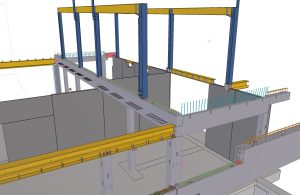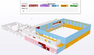 A combination of a concrete and steel structure was chosen for the building. On the one hand, elements of the concrete structure (columns, beams, solid and insulated concrete walls, precast concrete walls) were elaborated into production drawings for our own production site Van Maercke Prefab NV. For this purpose, Stadsbader NV has a planning tool developed in-house, which displays the status of each element in Trimble Connect. On the other hand, the various ifc models were transferred to various producers of, among other things, the hollow walls, prestressed hollow floors, wide-floor slabs, stairs and steel structure.