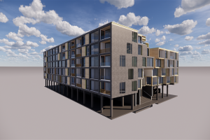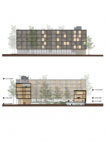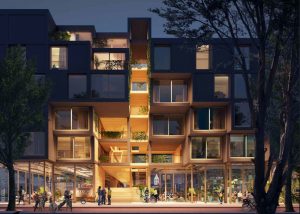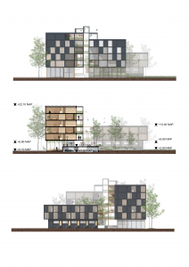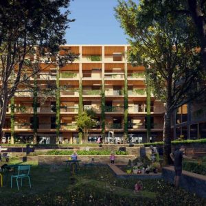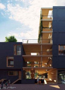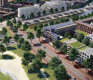 Juf Nienke will be a fully circular, nature-inclusive and energy-positive building with a sturdy and urban appearance, designed by RAU and SeARCH for Dokvast. It has a 15m high wooden main supporting structure on top of a concrete table structure. The materials used for Juf Nienke are for the most part biobased and recycled; they have a low environmental impact and are largely renewable. Because the building is constructed almost entirely of wood, the homes save more than 580,000 kg of CO2, thus actively contributing to a better climate and a healthy living environment. Moreover, thanks to the industrial prefabrication of the wooden modules, the impact on the site is minimal and noise nuisance, waste flows and construction time are limited.