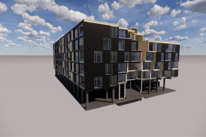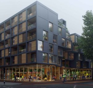 Juf Nienke is the new entrance building of Centrumeiland on IJburg and after completion the most sustainable residential building in Amsterdam. Miss Nienke contains 61 apartments, specifically intended for teachers and other key professions such as care or safety. The whole is built up with a smart circuit of prefabricated wooden modules (HSB and partly CLT). The residential modules come ready-made from the Barli housing factory and are driven from Uden to Amsterdam, where they are stacked in the right place with one crane. The modules have a standard width of 4m with varying depths and can be dismantled so that the building can easily be adapted for future use.