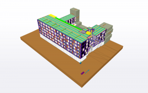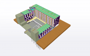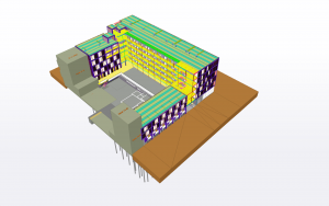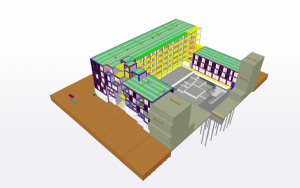 Juf Nienke is op veel vlakken een bijzonder project, niet in de laatste plaats omdat de 61 appartementen modulair en in hout gebouwd worden en deze constructieve opbouw nog nooit eerder is gedaan. Naast de bouwkundige complexiteit is het een enorme uitdaging om met veel verschillende partners in één model te werken, van architect en co-aannemer tot opdrachtgever en diverse onderaannemers. In de engineering werken partners zelf specifieke onderdelen uit (zoals de betonnen onderbouw, de kozijnen, E-, W- en Nuts, maar ook de dakdekker) én het model wordt intern in diverse delen van ons productieproces gebruikt. Zowel in de geautomatiseerde prefabricage van onze houtskeletbouw-elementen (2D) als in de assemblage (3D) in onze hallen én op de bouwlocatie in Amsterdam. Vanuit Tekla Structures sturen wij al onze machines aan: van Hundegger, platenzaag tot Mobi: een papierloos digitaal proces!