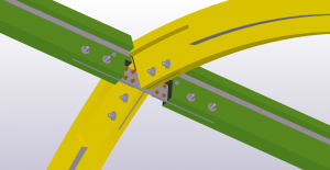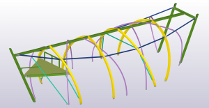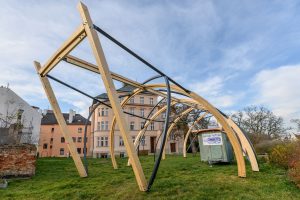 The wooden structure of the temporary roofing in the shape of a ship consists of four transverse curved frames with different geometries. The frames are connected at the top by wooden beam and by the system of curved and straight steel bracings. The three frames are inclined from the vertical plane with an angle of 15 °. The bow of the ship is formed by one inclined wooden column. The stern of the ship by two inclined wooden columns. At the space of the bow in between the first column and the first frame, there is inserted wooden floor. The separated structure of the cloakroom made of thin-walled steel is situated at the space of the stern. The structure can also be assembled only partially using two stern columns and two adjoining curved frames.