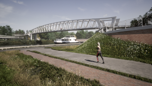 Cycle loops will be used on both banks to occupy as little space as possible and to minimise the slope. As the northern bank is a flood-prone area, the access ramp here will be built on piers. On the southern bank the ramp will be built on the slope. The cycle loops will have railings, a start and stop lane and rest areas where the slope is more limited. Planting will be provided between the various elements. Pedestrians will have access to the bridge via stairs that run between the pillars. On the southern bank, a footpath will be provided next to the access ramp to allow pedestrians a safe passage from the Zuidkaai to the Vaarstraat. From the cycle loops and bridge, active road users will always have a good view of the canal.