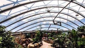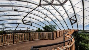 The use of ETFE foil cushions (ethylene-tetrafluoroethylene) mounted from the inside of the steel structure of the dome covering allows for excellent natural lighting, significantly reducing the need for artificial lighting. Additionally, natural light, combined with tropical vegetation and the climate inside the hall, creates a tropical atmosphere, making visitors feel as if they are in an exotic environment.