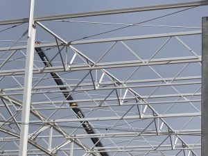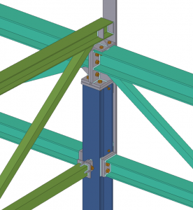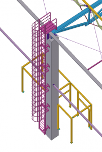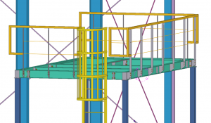Słupy części głównej żelbetowe. Dach, podesty oraz wiata w konstrukcji stalowej. Zakres realizowany w Tekli obejmował projekt warsztatowy elementów stalowych.