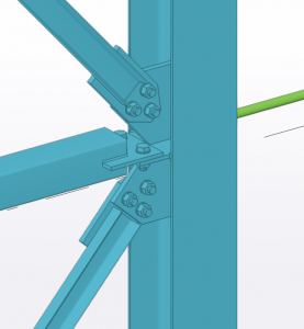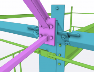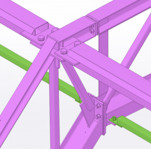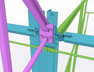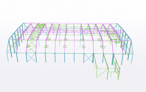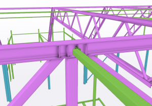 Obliczenia dla tej 120-tonowej konstrukcji o wymiarach 28 m x 78 m x 14 m były prowadzone z uwzględnieniem najwyższej w Szwecji klasy konsekwencji – SK3, ponieważ jest to obiekt sportowy. Ze względu na wymagania klienta i nieregularny układ słupów, przygotowaliśmy dodatkowy system ich stabilizacji. Podciąg kratowy nie znajdował się w kalenicy – był przesunięty o około 1.4 m. Żeby maksymalnie zoptymalizować pracę układu, kratownica główna została połączona z podciągiem kratowym w sposób przegubowy, natomiast z samym słupem na sztywno.