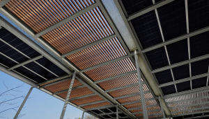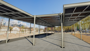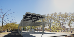 La marquesina formada por una estructura metálica galvanizada y madera, esta situada en la zona verde de la Marina del prat vermell de Barcelona.