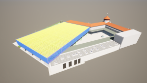 O revestimento deste novo corpo garante o sombreamento e impermeabilização do espaço e tem como referência o módulo triangular do torreão preexistente, como meio para uma maior integração na envolvente.