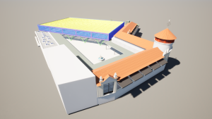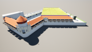 – to the North, by the captain Manuel Carvalho Street and to the West, by the D. Maria II Square. The courtyard, at a lower level, was supported by three buildings in which was sold meat, fish and fruit. The main volume, which was maintained and rehabilitated in the architectural Project, takes form of a broken line in blueprint, but in a higher level it accompanies the street front. The interior spaces are occupied by several commercial establishments (street stores).