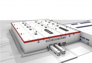 Presented model is a structure of the production and warehouse building extension with the warehouse building and locker room building.