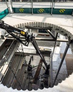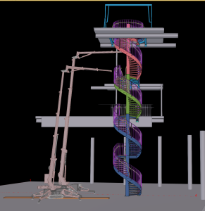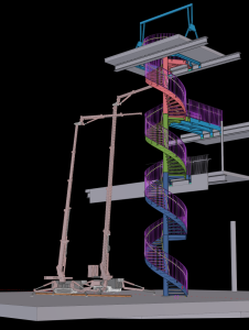 Tijdens dit project kwamen we verschillende uitdagingen tegen. Allereerst moesten we onder een bestaande loopbrug door, waardoor de trap niet te hoog kon worden. Het dak kon niet meer opengehaald worden, dus we moesten de trap inpandig opbouwen. Vervolgens bleek de vloer van de begane grond niet sterk genoeg voor een zware kraan, waardoor we dragline schotten hebben aangebracht en het gewicht over verschillende spinrupskranen hebben verdeeld. Ook was de begane grond niet sterk genoeg om de trap te kunnen dragen. Daarom hebben we in de kelder een constructie aangebracht om de vloer sterker te maken.