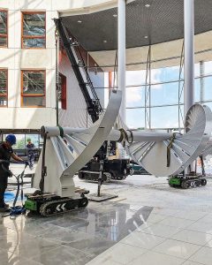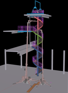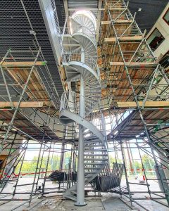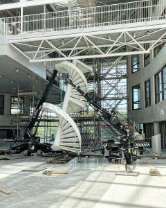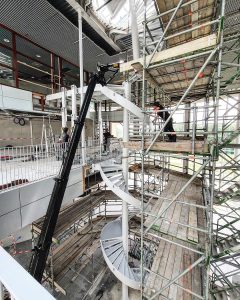 We encountered several challenges during this project. First of all we had to pass under an existing walkway, which prevented the staircase from getting too high. The roof could no longer be opened, so we had to build the stairs indoors. Next, the ground floor turned out not to be strong enough for a heavy crane, so we installed dragline bulkheads and distributed the weight across several spider cranes. Also, the ground floor was not strong enough to support the stairs. For this, we added a structure in the basement to make the floor stronger.
