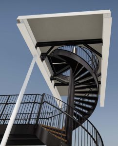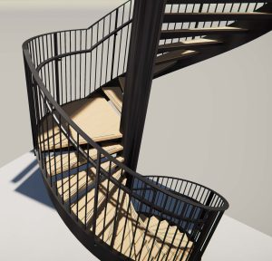 At the Police Department in Utrecht, we built a spiral staircase in an existing building. First, we measured the existing floors with a total station, then we drew the stairs in Tekla and had them calculated. There was no recess in the top floor, so we made a construction for this, so that a recess could be made in the top floor. We then produced and assembled the staircase on site. The staircase is a combination of steel and wood.