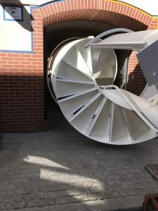 The main structure of the stairs is an internal spiral beam in the form of a spiral ribbon with a diameter of 273mm made of 10mm thick steel sheet. The lower end of the beam was supported on the reinforced concrete floor slab and the upper end was connected to the platform elements. The stroke width of the beam was chosen so that it also constituted an internal balustrade with a height of 1.10m.