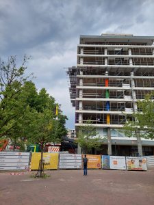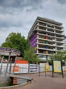 Realizing the congestion is quite a challenge to absorb these extra forces that come with it. To save weight, the top three floors will be demolished first and then the remaining existing construction will be reinforced with struts. These struts are connected to each other from top to bottom of the building through the concrete floors, whereby the floors then have to be poured through the hollow spaces in the floor. Once the existing building has been fully reinforced, the topping consisting of another eight floors can be built on top of it.