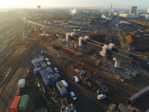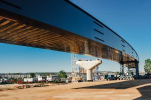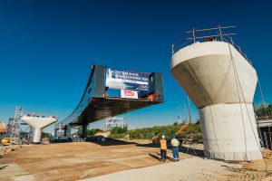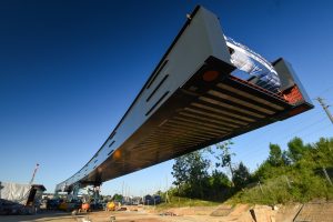 This viaduct, with a length of 620.95m, is located in Mantes-la-Jolie and is part of an extension of the railway lines from Paris to the west. The viaduct consists of 3 sub-viaducts. The section exists of 2 vertical caissons with spacers (bridge pieces). The height of the box girders is 3.5m, the total width of the viaduct is 8.4m. The different sections (box elements) will be manufactured in our workshops in Belgium and transported by truck to the construction site in Mantes-la-Jolie. On the assembly site the sections will be pre-assembled with the bridge parts and then handled on temporary piers next to the final piers. After welding and concreting on the temporary structures, the load transfer to the supporting devices will be carried out. The challenge was that a 125m long part of the viaduct has been installed above the tracks by SPMTs.