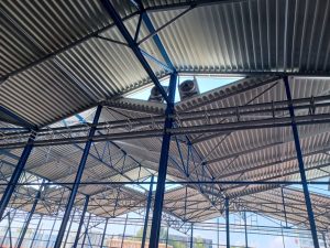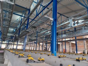 The dominant feature of the new Vozovna Hloubětín in Prague (Czech Republic) is the main object SO702 – the Tram Parking and Maintenance Hall. This five-bay steel hall with a rectangular floor plan, measuring 95x136m and with an attic height of +13.65m, is largely based on the design of the original hall, which was built in 1951. The main architectural element is the roof structure. It consists of a series of gable roofs, which are shifted between them by half the span in the longitudinal direction, which creates a side rhombus skylight in each wave of the roof. In the C axis, the waves in the neighboring bays are shifted only horizontally, so there is a continuous transillumination copying the slope of the roof.