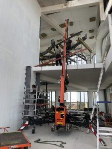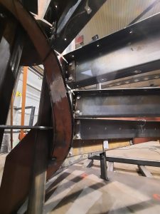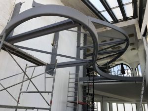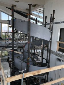 De plaatsing van deze stalen trap gebeurde in het voorjaar 2022. Andere partijen zullen de trap vervolgens afwerken met o.a. gyproc leuningen en vloerbekledingen.