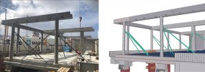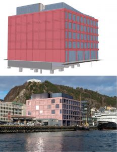 Konstrukcję piwnicy stanowią monolityczne ściany oraz słupy posadowione na palach z racji bezpośredniego sąsiedztwa zatoki oraz portu. Powyżej poziomu gruntu wszystkie elementy betonowe są prefabrykowane i wykonane w pobliskiej fabryce Spenncon AS w Hjørungavåg, zaprojektowane w CES Polska w Łodzi. Charakterystycznym elementem są elementy fasady wykonane z betonu barwionego w masie o bardzo nowoczesnym i estetycznym kształcie. Dzięki technologii BIM i ciągłej wymianie modeli IFC między branżami na platformach on-line mogliśmy dopracować te elementy w najdrobniejszych szczegółach aby możliwy był montaż oświetlenia LED czy elektrycznych rolet przeciwsłonecznych.