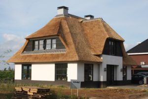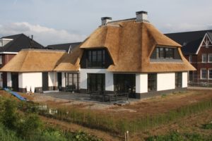 Het betreft een project met een complexe prefab houten kapconstructie met rieten dak op een vrijstaande woning en garage.
